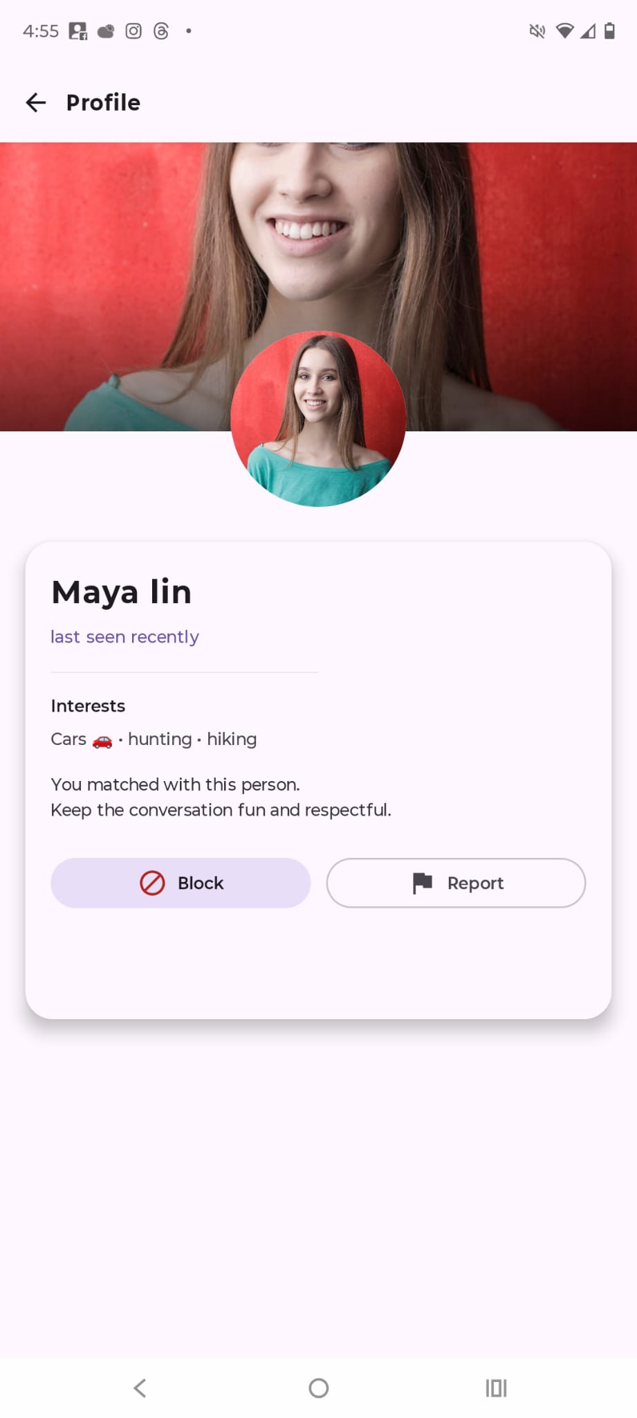 PEEL is built around clean profiles, easy matching, and respectful conversations. You always have quick access to block and report tools.